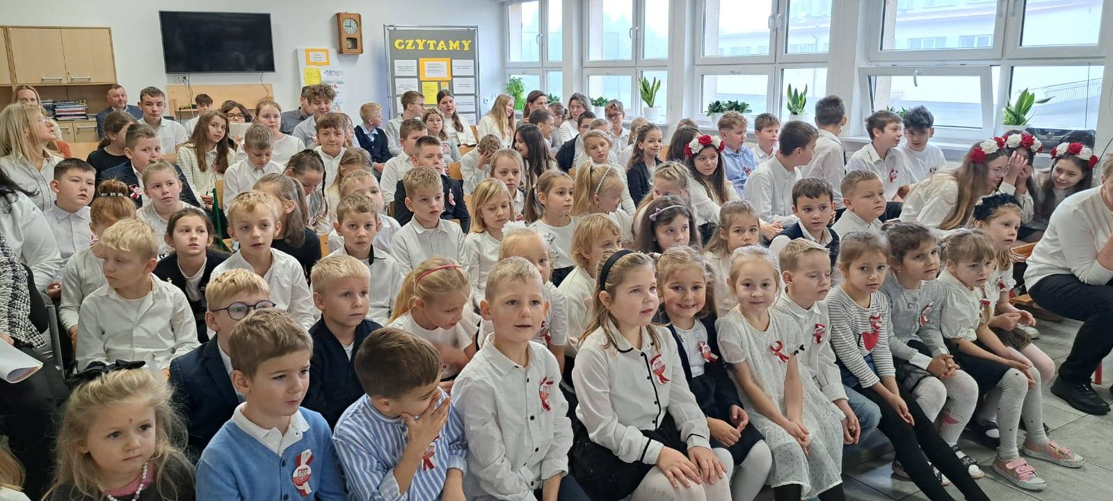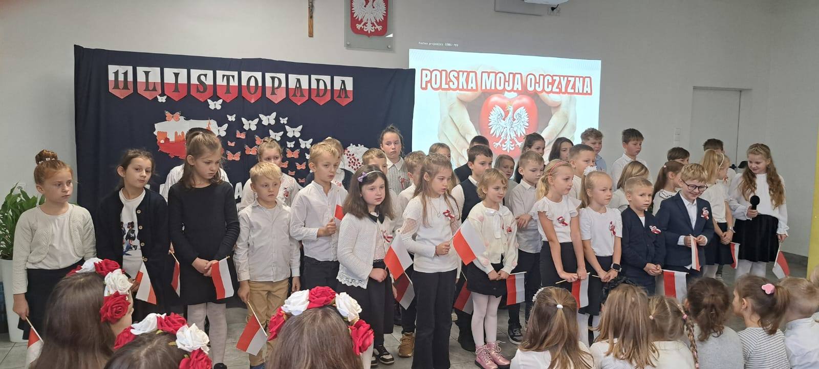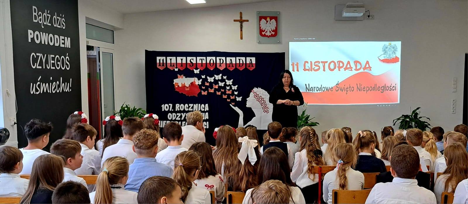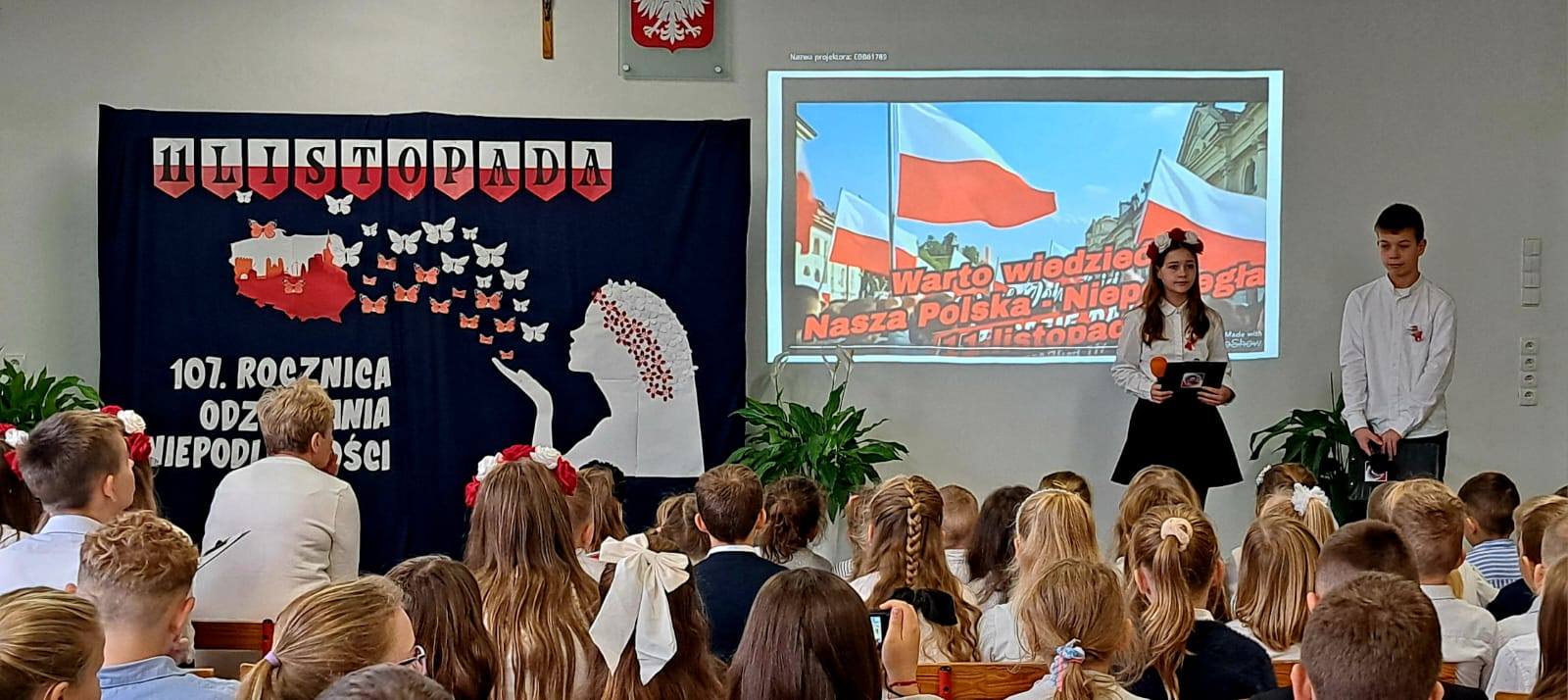 107 lat temu po 123 latach zaborów Polska odzyskała niepodległość. Piątkowa akademia (przygotowana przez uczniów klasy VII, a uświetniona występem dzieci ze starszej grupy przedszkolnej oraz z kl. I - III) wprowadziła wszystkich w świąteczny nastrój. W montażu słowno-muzycznym uczniowie przedstawili drogę naszej Ojczyzny do wolności, przypominając o tym, co ważne dla każdego Polaka. To pamięć o przeszłości naszego narodu, szacunek dla narodowych symboli, miłość ojczyzny, to godność i duma z bycia Polakiem.
