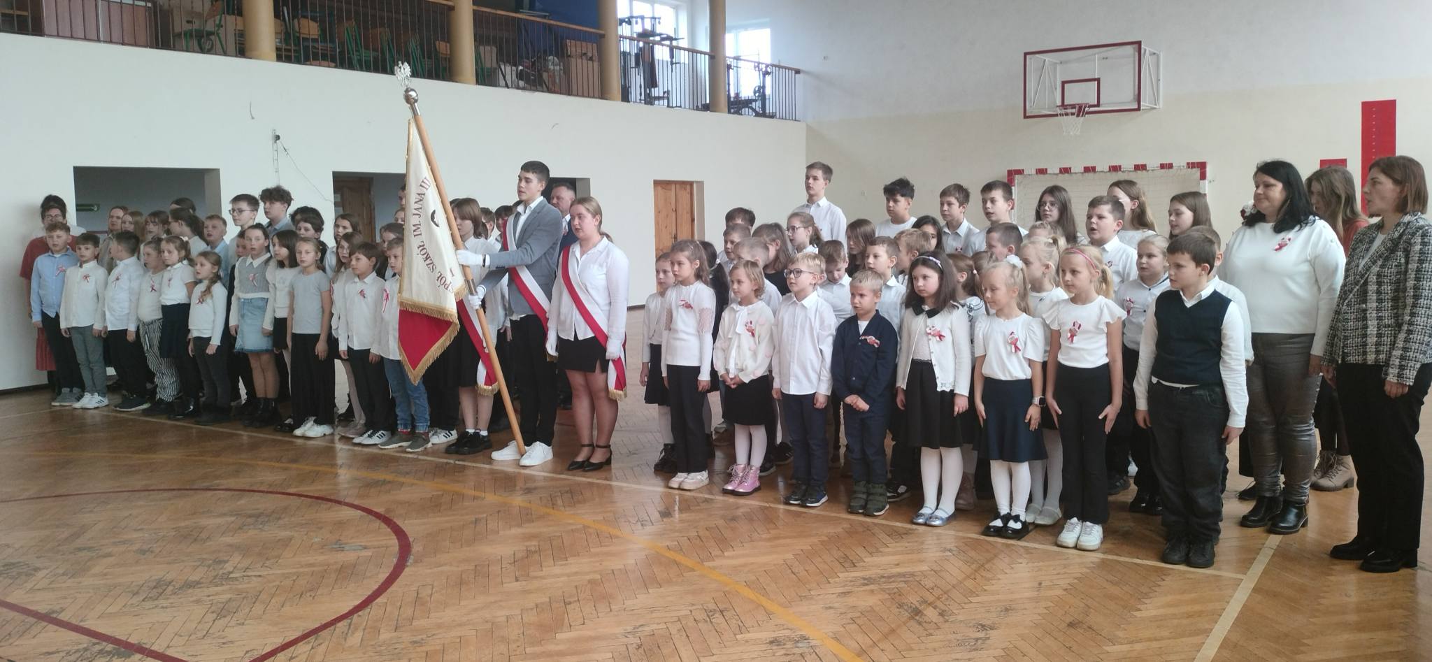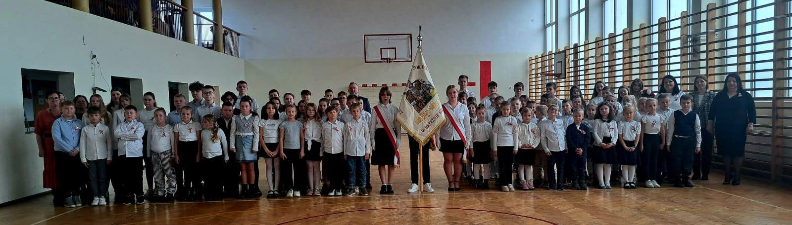 Ostatniego dnia nauki przed Świętem Niepodległości o symbolicznej godzinie 11.11. uczniowie kl. I - VIII z pocztem sztandarowym na czele zebrali się w sali gimnastycznej, aby - w ramach akcji organizowanej przez MEN "Szkoła do hymnu" - razem z innymi szkołami uroczyście zaśpiewać "Mazurek Dąbrowskiego", który od blisko stu lat - od 1927 roku jest naszym hymnem państwowym.